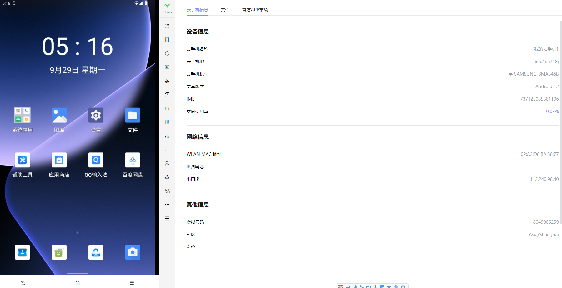 左侧展示的是云机投屏画面及云机相关操作按钮,右边展示的是云手机信息、文件、官方APP市场。