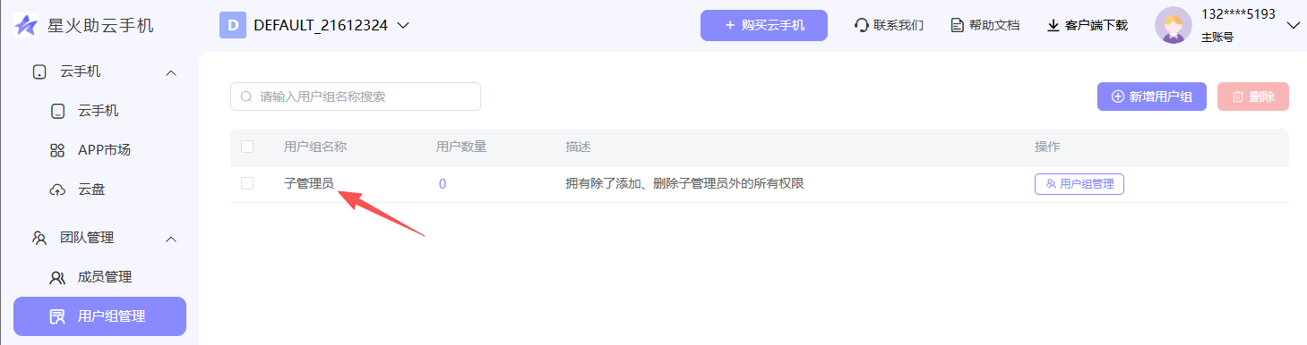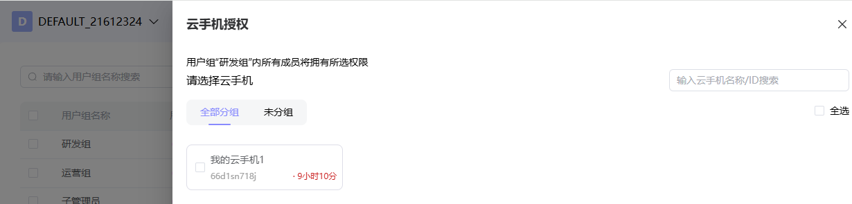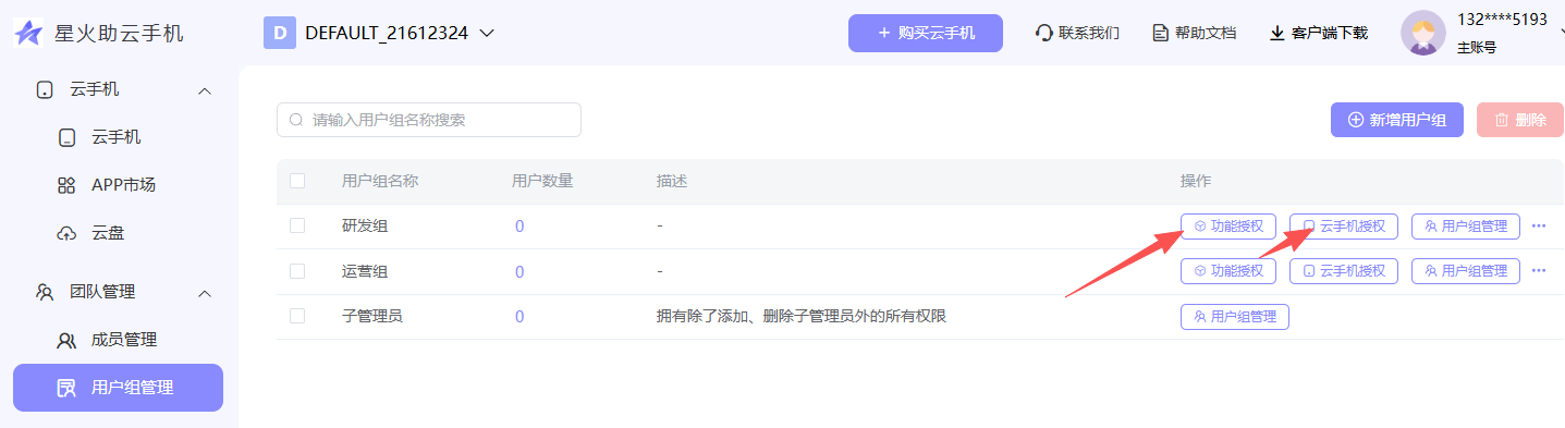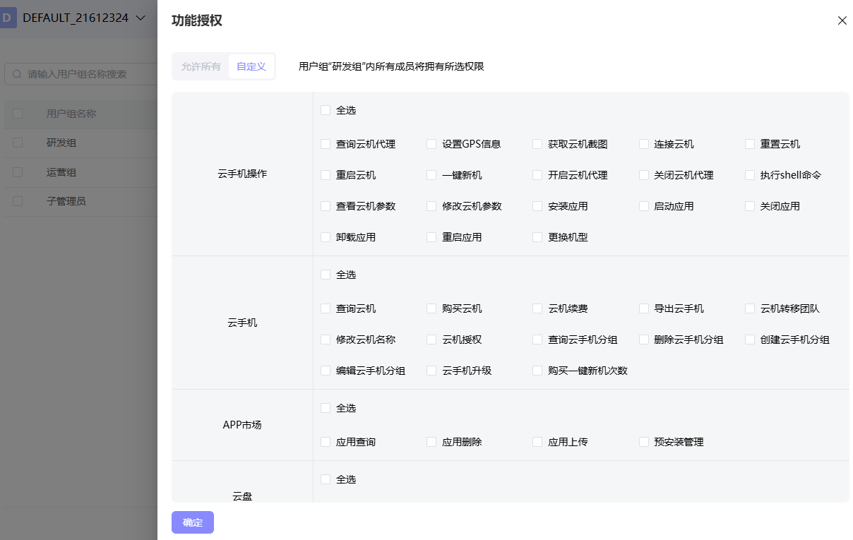在普通用户组中,可以对不同用户组分配不同的“功能权限”和“云手机权限”。
