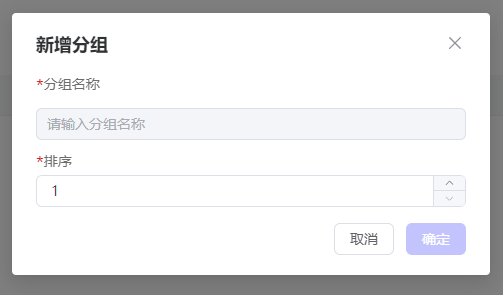 点击“新增分组”按钮,在弹出的弹窗中输入分组名称,可输入数字排序分组,数字越大分组顺序越靠前。