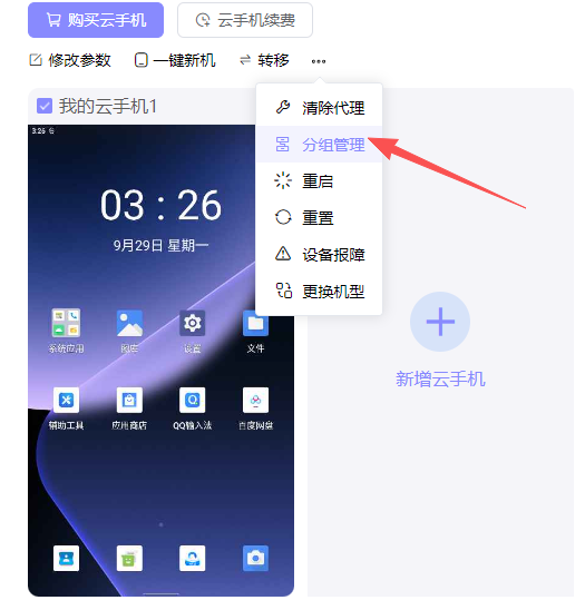 创建好分组后,可以将云手机添加到不同的分组进行管理,支持一键批量操作,选择需要分组的云手机,点击...->【分组管理】