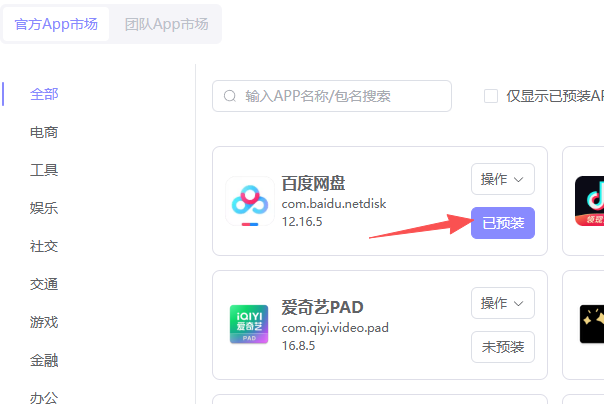 4、当出现预装成功之后,预装的APP会显示“已预装”状态