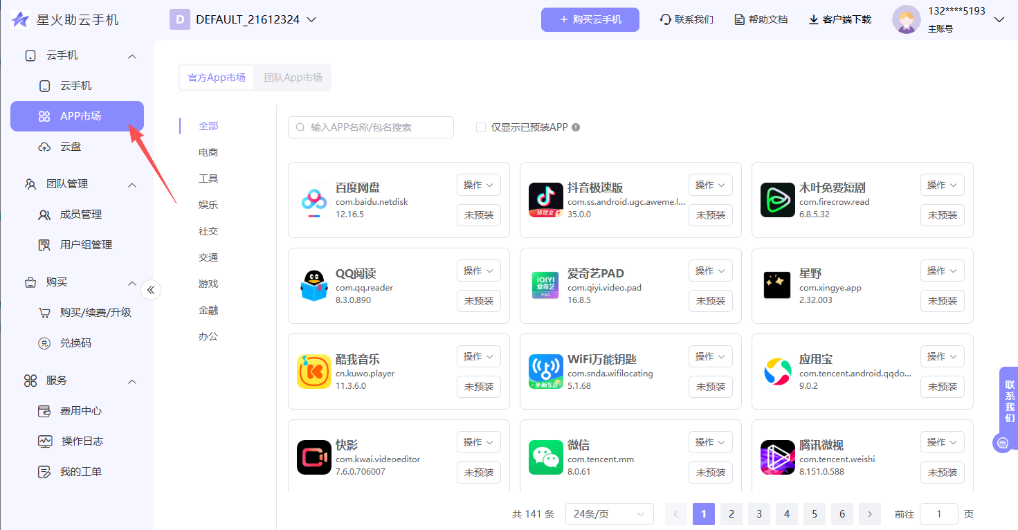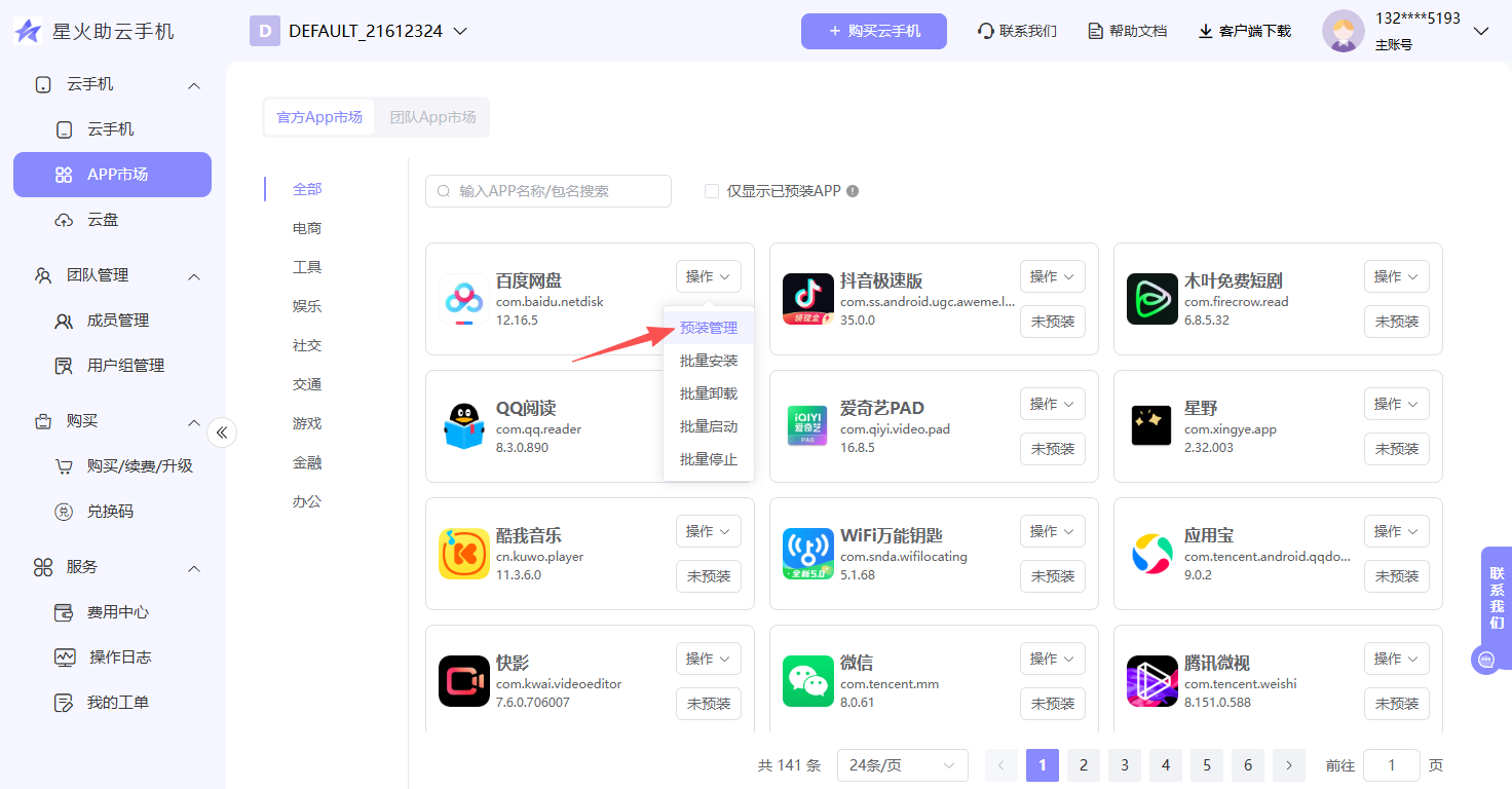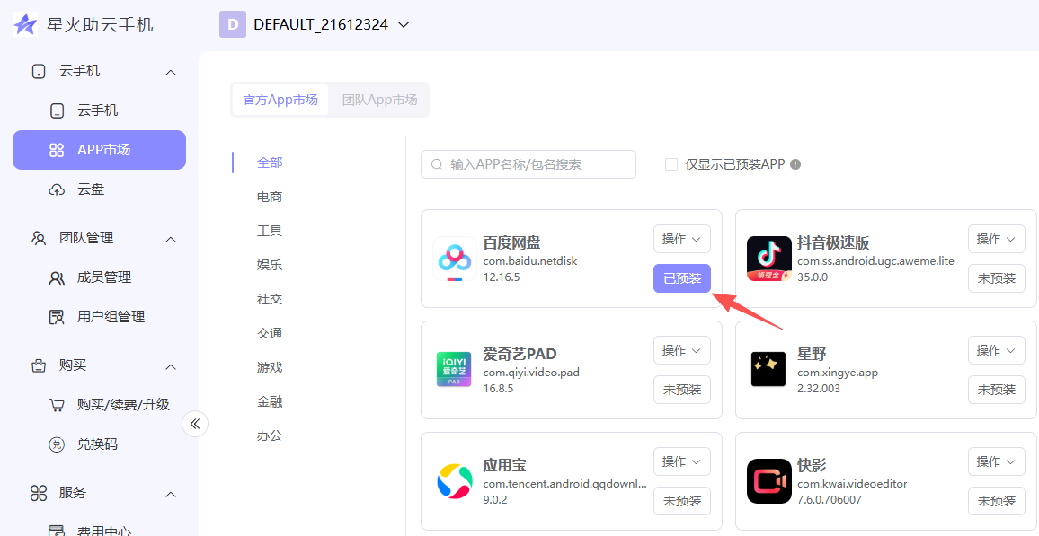 星火助云手机支持一键预装APP,当重置云机/新购云机时,云机会自动进行安装该应用(一个团队预装应用数量有限,预装太多会影响云机运行速度)。