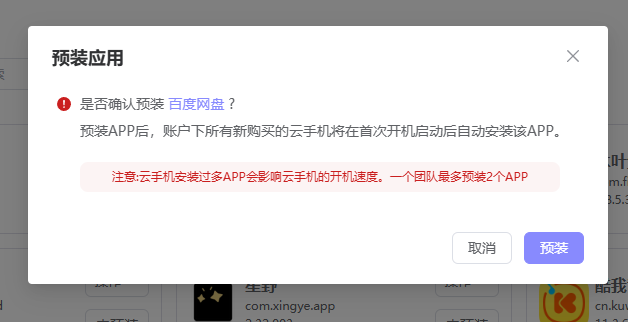 3、会弹出预装确认弹窗,点击“预装”按钮,完成预装。当重置云机/新购云机时,云机会自动进行安装该应用。